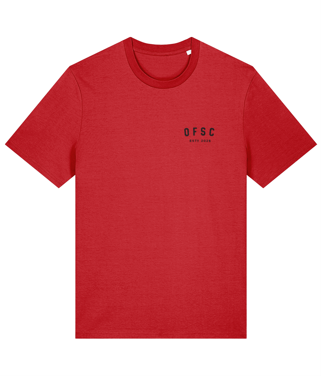 This medium fit red tee features an OFSC front and back panel print on soft 180gsm organic cotton.